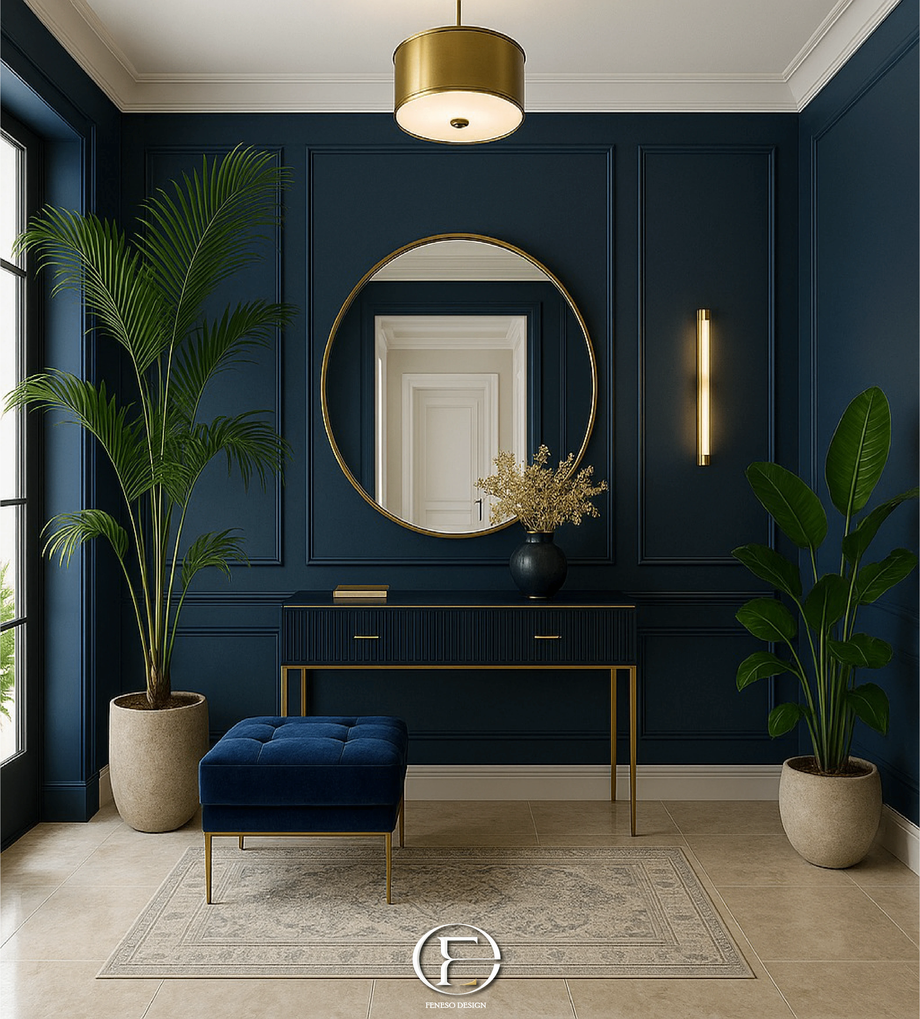 - "This elegant entryway design blends modern sophistication with natural elements. Featuring navy blue accents, gold lighting, and lush indoor plants, it creates a welcoming and stylish first impression. The space balances warmth and minimalism, setting the tone for the villa’s contemporary interior.."— Entryway , Dubai , 2024