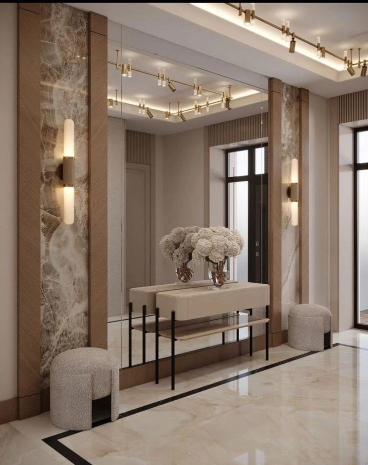 - "This elegant entryway design blends modern sophistication with natural elements. Featuring navy blue accents, gold lighting, and lush indoor plants, it creates a welcoming and stylish first impression. The space balances warmth and minimalism, setting the tone for the villa’s contemporary interior.."— Entryway , Dubai , 2024