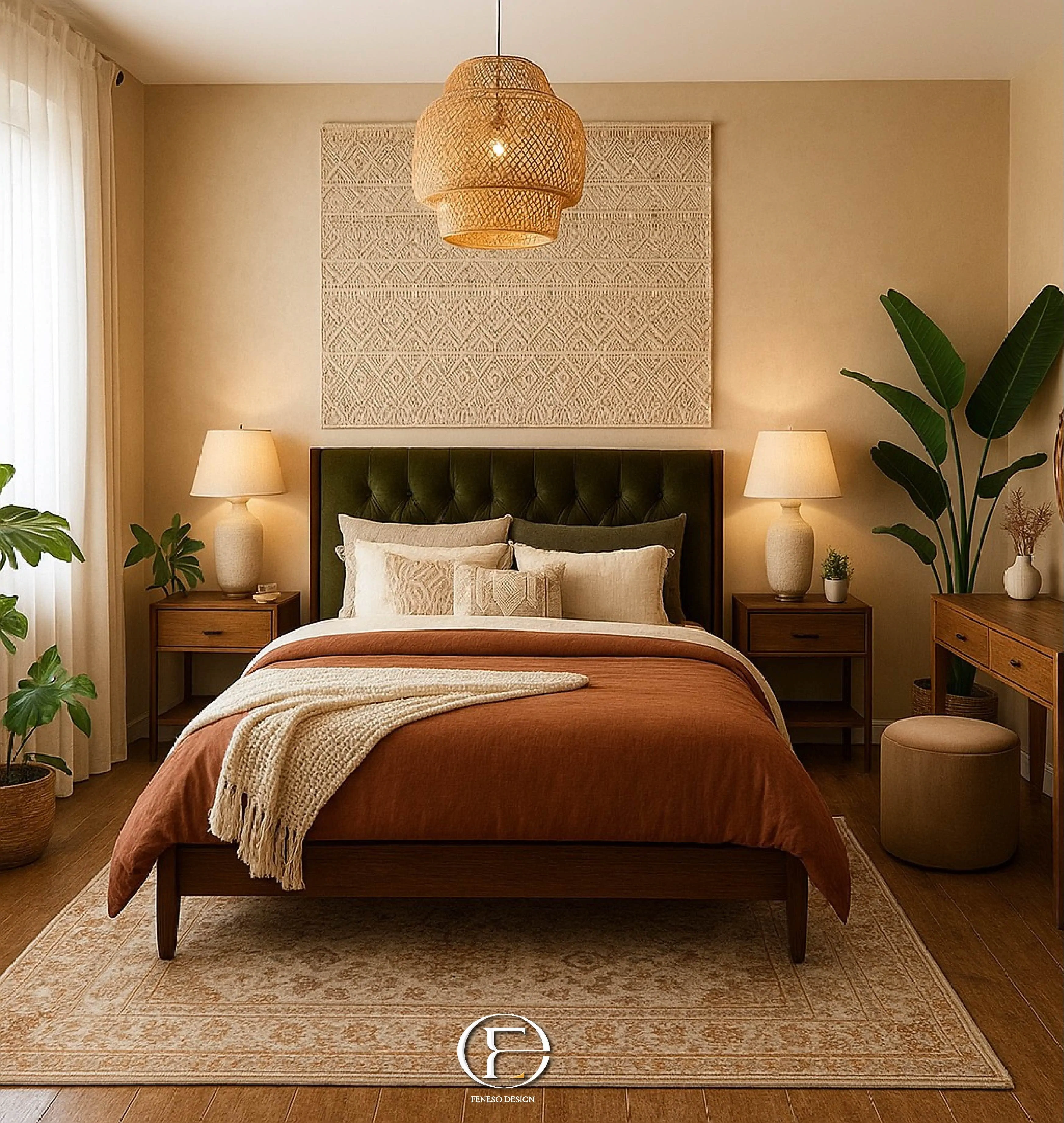 - "This bohemian-inspired bedroom blends natural textures, earthy tones, and eclectic patterns to create a warm and relaxed atmosphere. Layered fabrics, rattan accents, and soft lighting add depth and personality, making the space feel both cozy and expressive."— Bedroom Design, Abu Dhabi-AL Reem island-2025
